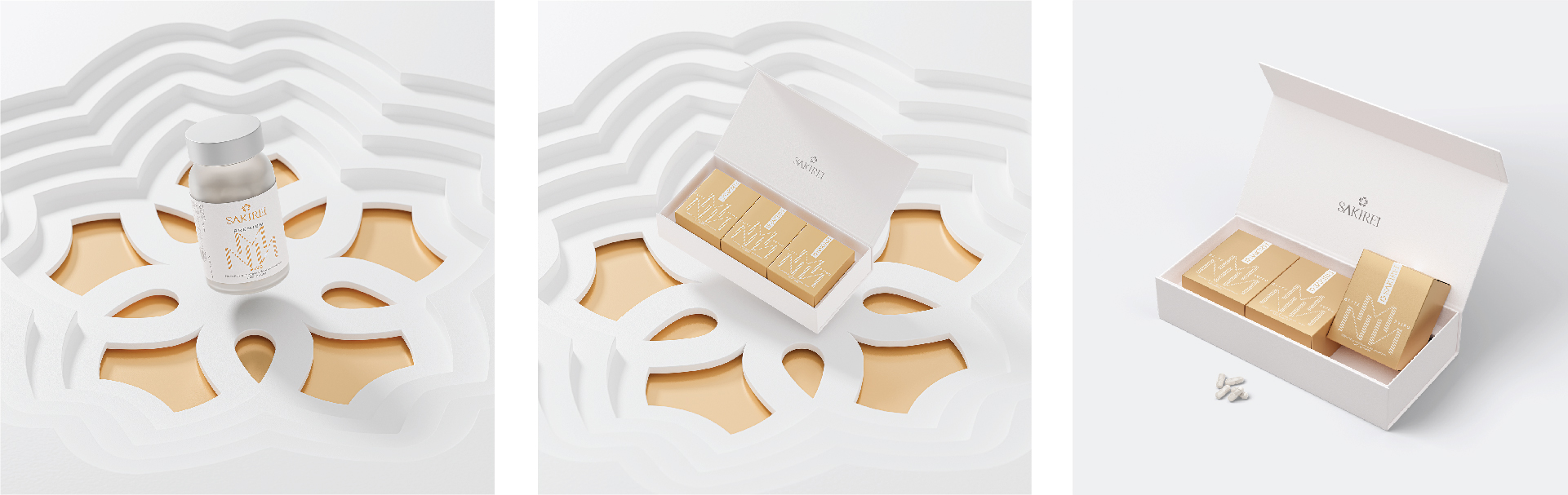 Our team were honored to receive a project with a mission of creating stunning 3D imagery aimed at introducing and promoting the SAKIREI – NMN health care product line. This endeavor begins with the reception of detailed 2D design drawings and specific project requirements, particularly focusing on the desired clarity and purity of the product imagery.